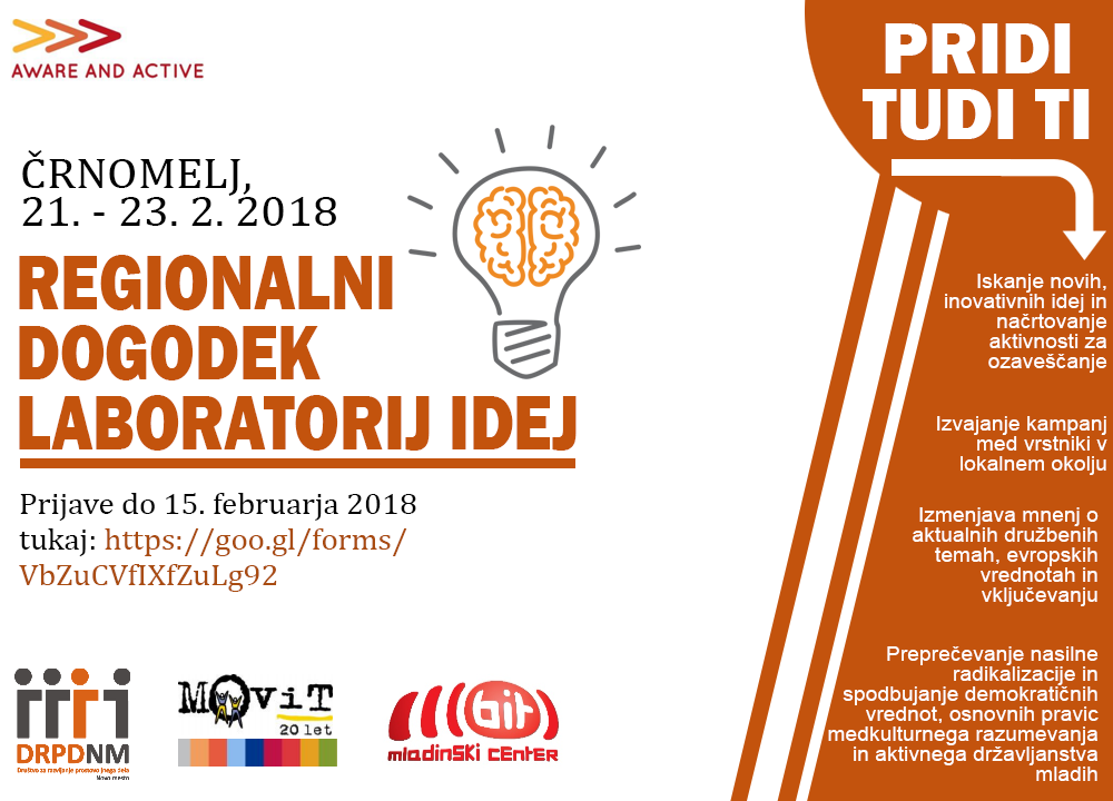 Laboratoriji idej so namenjeni vsem mladim, starim od 18 do 30 let, ki želijo razvijati svojo ustvarjalnost, se pobliže spoznati s temami kritičnega mišljenja in vključujoče in strpne družbe, zasnovati svoje aktivnosti za ozaveščanje in jih kasneje ob finančni podpori organizatorjev tudi izvesti. Organizacije pozivamo, da k udeležbi spodbudijo mlade, s katerimi delajo ter razširijo vabilo po svojih omrežjih.
